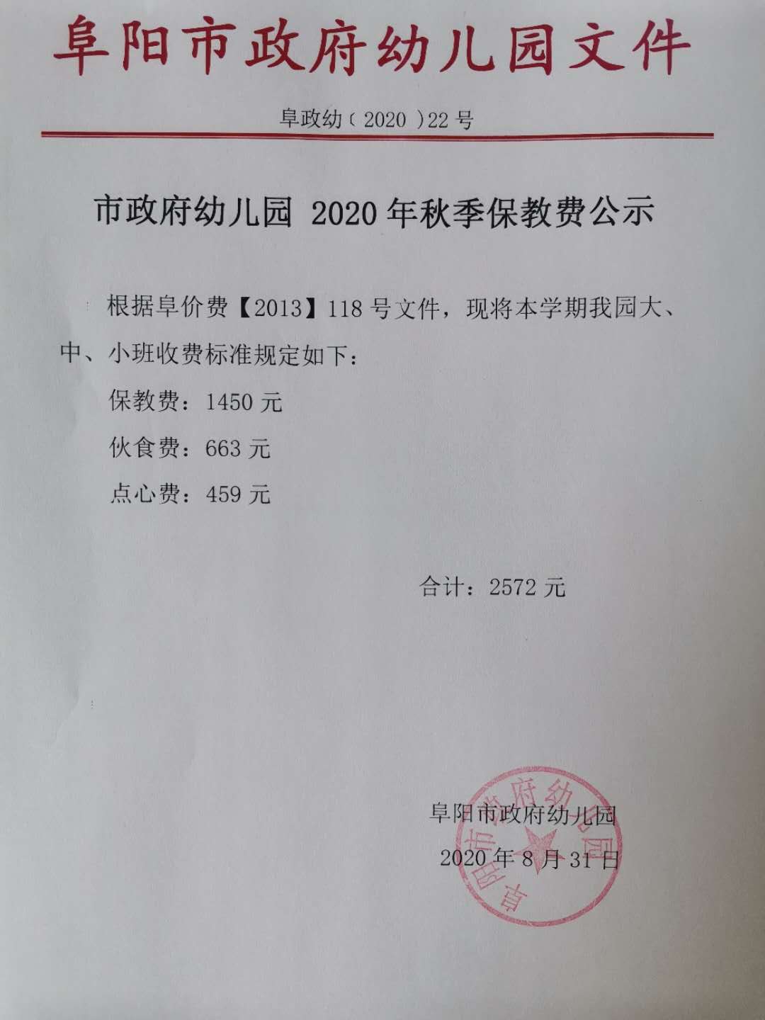 根据阜价费【2013】118号文件,现将本学期我园大、中、小班收费标准规定如下: