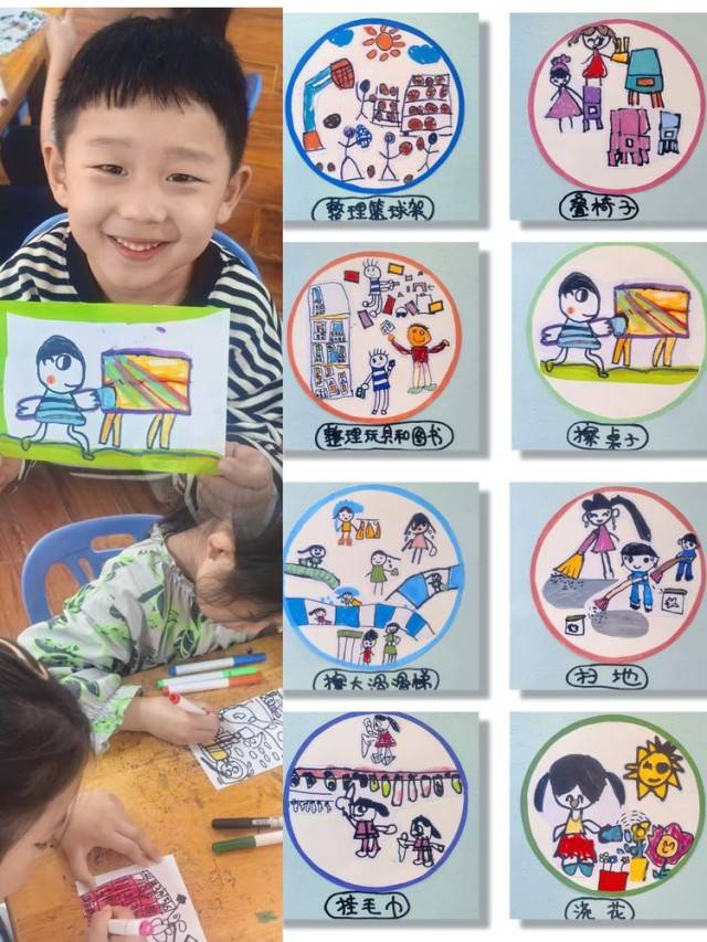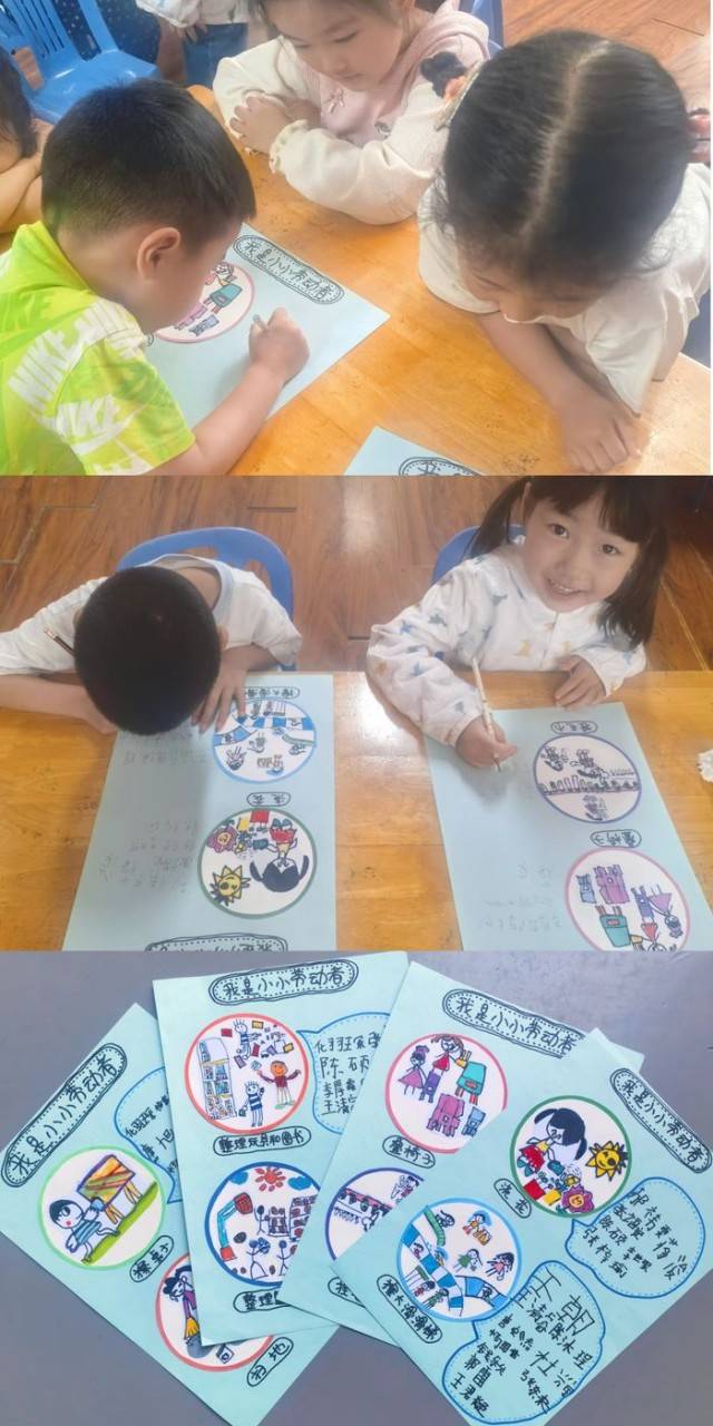 随后,孩子们化身“设计师”,绘制个性化劳动打卡表,从每日值日到垃圾分类,每项任务都承载着他们对劳动的理解。