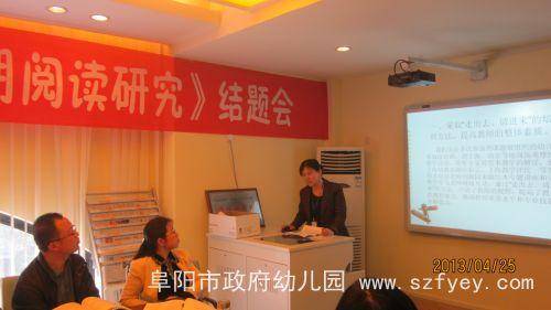 在结题会上,我园彭华园长就幼儿园的子课题《让孩子享受和体验阅读活动的快乐实践研究》进行汇报,彭园长从幼儿早期阅读存在的问题、幼儿园课题研究目标、幼儿园课题研究的方法、幼儿园课题研究内容与过程、幼儿园课题研究成果、幼儿园研后反思等六个方面进行汇报。