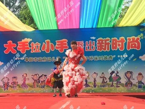 时装表演之前,彭园长代表全园师生发表致辞,热烈欢迎各位家长百忙之中抽出时间来参加活动,也为孩子们送上了节日祝福,同时也向家长介绍了此次活动的主题:“大手牵小手,秀出新时尚”。接着,由小班家长委员会组成的评委代表发言。大家期待已久的时装表演终于开始了,随着动感的音乐,我们的大模特与小模特们自信地走在舞台上,向大家展示着他们自制的环保服装。这次时装表演的服饰全由幼儿与家长一起利用废旧物品制作而成,平时被我们视为废品的垃圾袋、纸盒子、破旧雨伞、饮料瓶、树叶等都被搬上了舞台。不信你瞧,一对母女将垃圾袋串在一起做成了漂亮的裙子,一家三口用纸盒子做成了一辆火车,另外一家呢,用树叶做装饰摇身变成“野人”三口之家;太多精彩的服饰,都让人眼前一亮,不禁使人感叹家长的创新精神和动手能力。舞台上的音乐声始终为模特们伴奏,舞台下的掌声也一直在为他们喝彩。