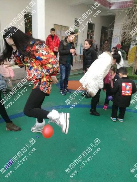 游戏“踩气球”:“大孩子们”忘情地游戏,孩子们在旁为他们鼓气加油!