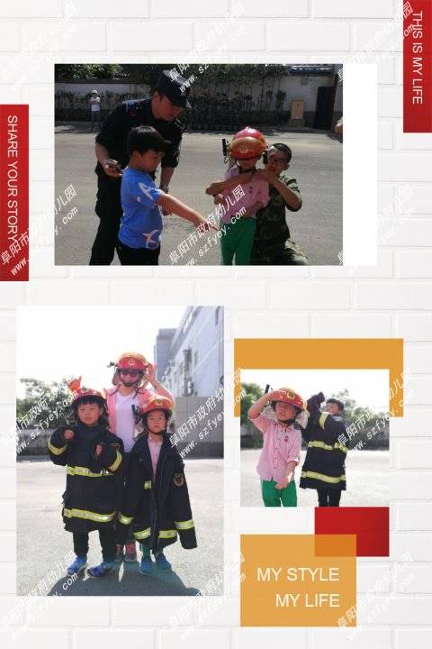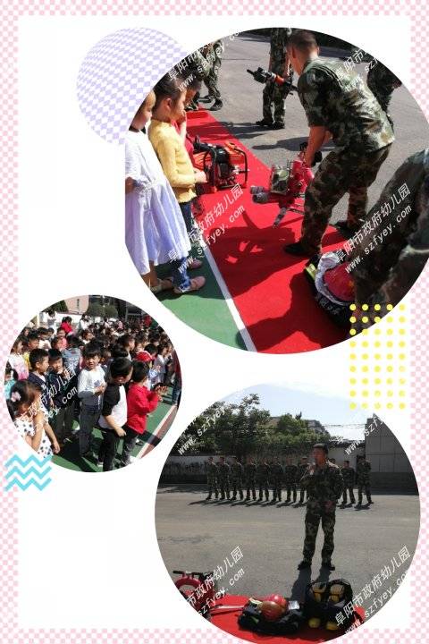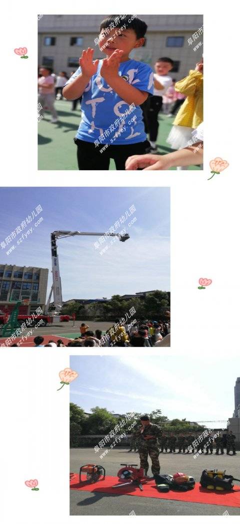 表演完毕,大家一同来到了营房前,消防员叔叔为孩子们逐一展示并详细介绍了消防队员的秘密武器——各种各样的消防装备和消防救生器材,孩子们认识了千斤顶、切割机、鼓风机、防毒服、消防服等各种器具和装备,同时也了解这些器材操作方式和用途。消防员叔叔还为孩子们提供了穿消防服、戴消防帽、乘消防车的机会。孩子们都很兴奋,脸上洋溢着自豪和满足的笑容,仿佛自己就是“小小消防员”,真正体验了一把当“消防员”的感觉。