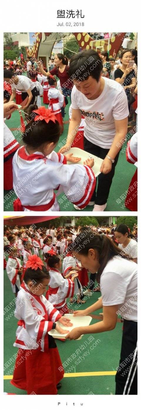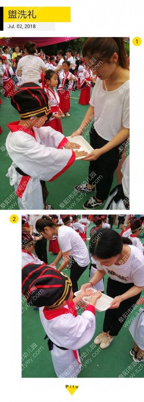 老师们端着水盘,将给孩子进行盥洗礼