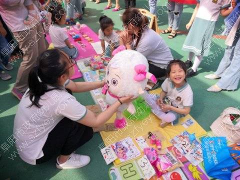 听, 小老板们的吆喝特别卖力:“走一走,看一看啦,特价大甩卖啦”、“快来看呀,我这里最便宜啊”……热情的吆喝吸引来了一大批顾客,前来慰问参观的黄市长也走向小老板们的摊位前。化身为一名“顾客”,与“小老板”亲切的交流。更有一些小班幼儿及家长游走在各个摊位之间,认真地挑选自己中意的商品,互相有模有样地讨价还价,买卖成交后,大家皆大欢喜,收钱找零。