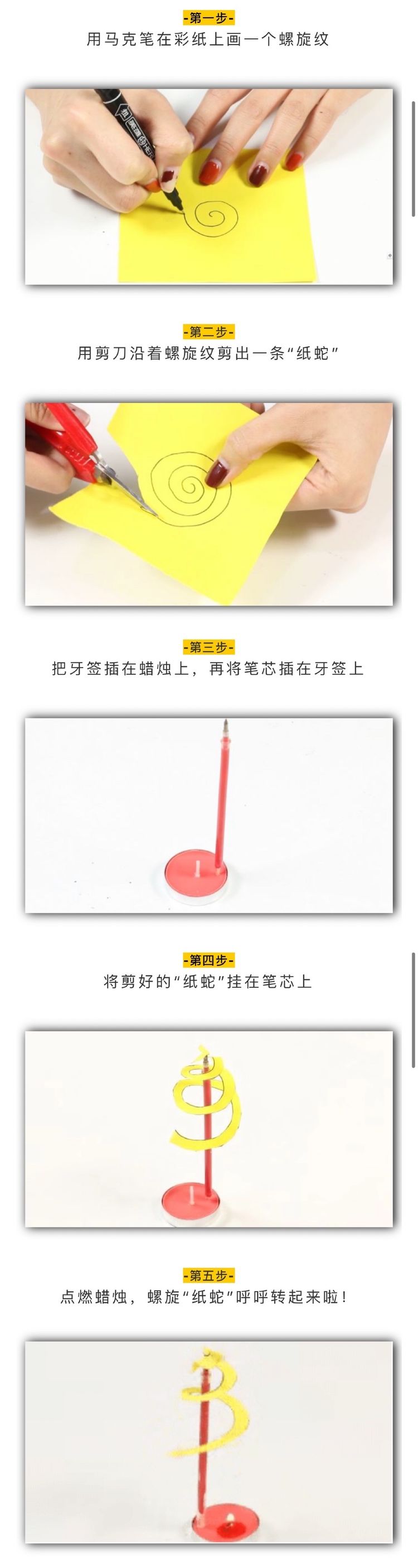 原来啊,是蜡烛点燃后,火焰的温度使上方空气温度升高,此时空气体积膨胀,重量减轻,热气流上升,这时周围的冷空气迅速填补,故形成循环,当循环的气流流过“纸蛇”螺旋的身体时,便带动“纸蛇”转起来了!你明白了吗?