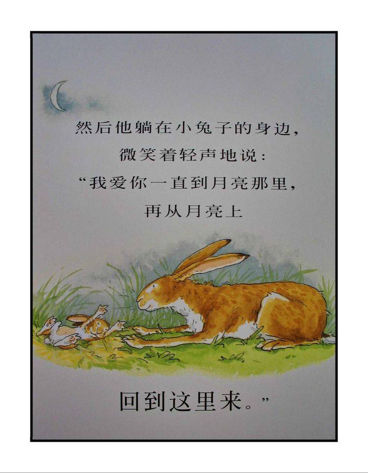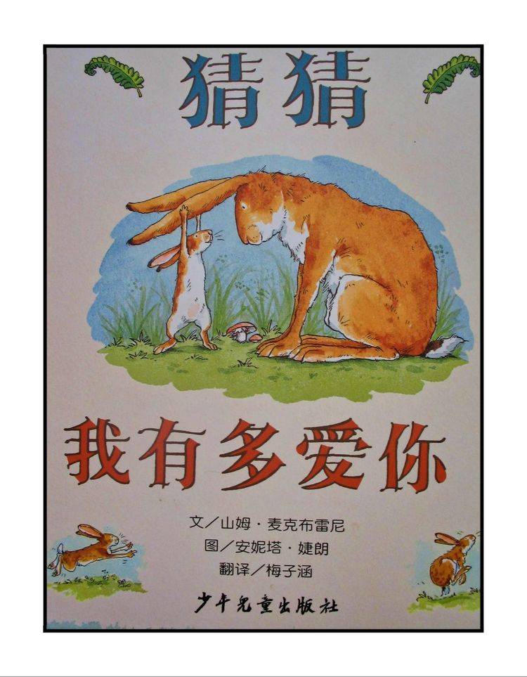 《猜猜我有多爱你》讲述的是大兔子和小兔子的故事,它们把爱用各种方法表示出来,用双手,用双脚,甚至把爱伸到了月亮上。小兔子想到的办法很好,但懵懂可爱的它不知道,妈妈的爱是那么那么多……