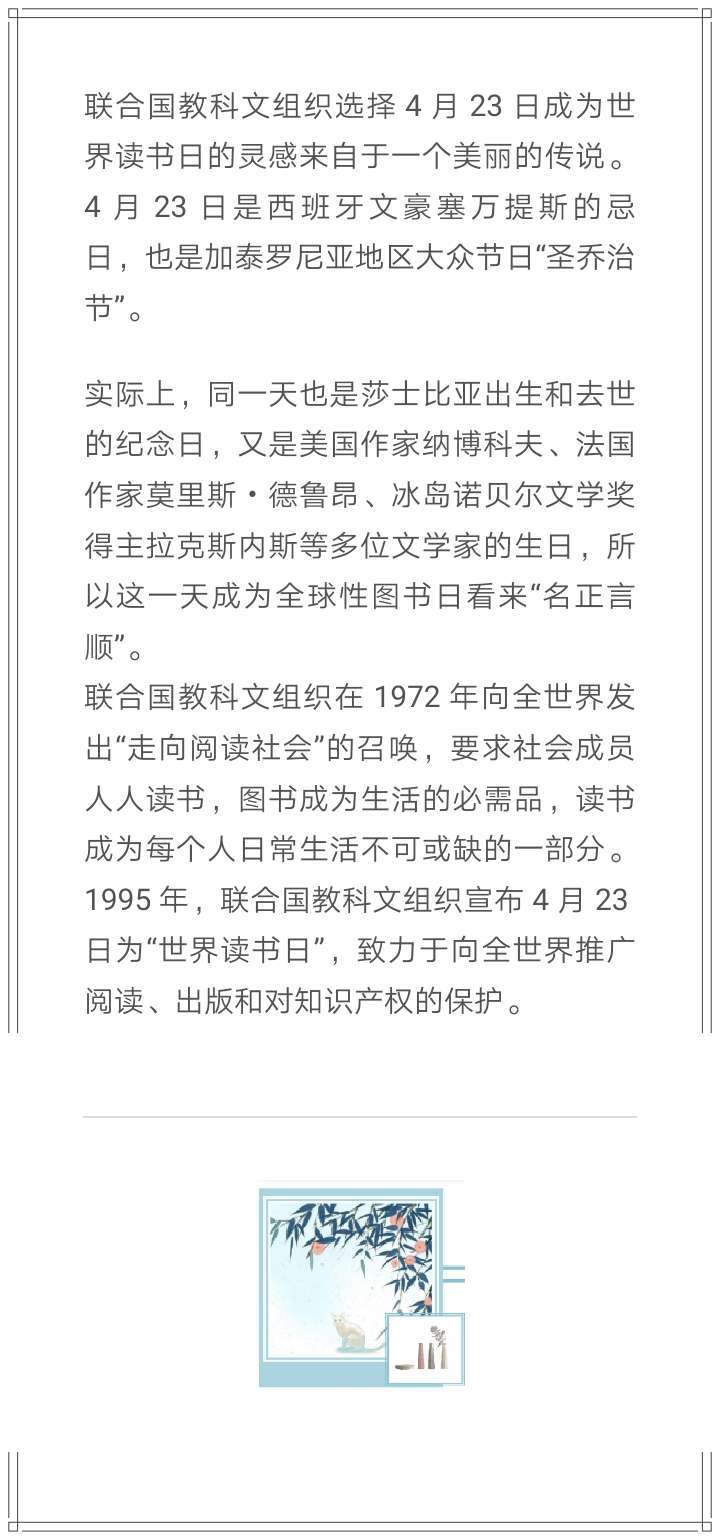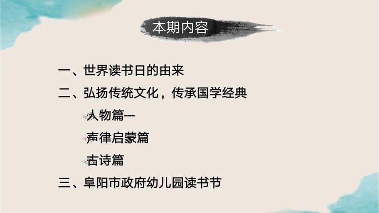 世界读书日设立的目的是推动更多的人去阅读和写作。希望所有的人都能尊重和感谢为人类文明做过巨大贡献的文学、文化科学思想大师们。一起来感受我们中国的国学文化吧~~