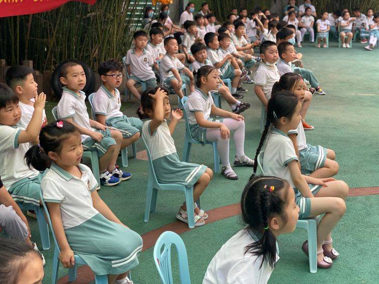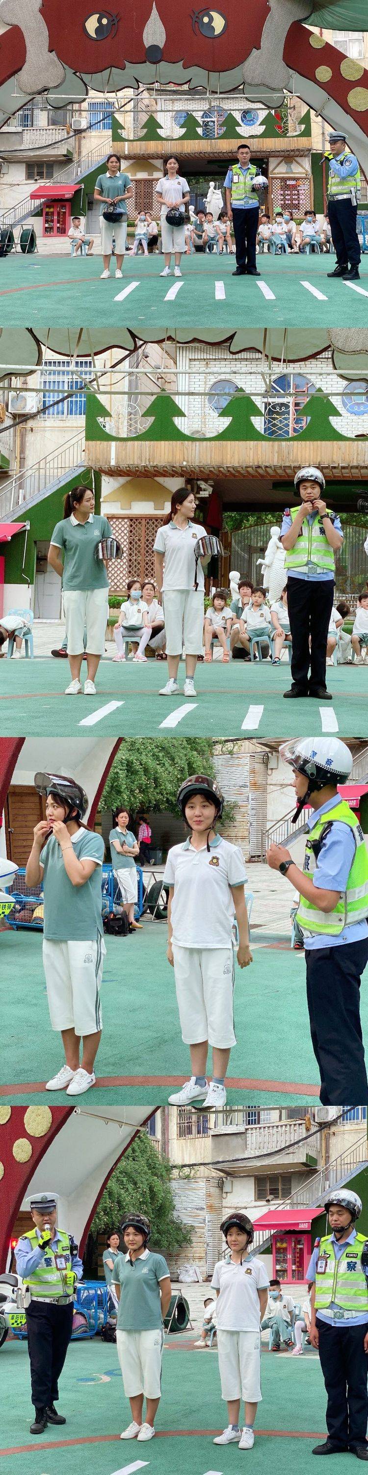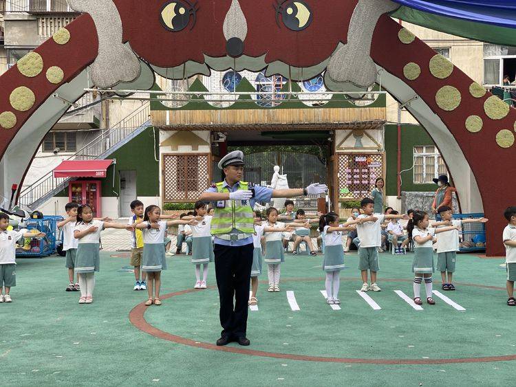 听,响亮的口令!看,威武的警容、标准的手势!原来是一大队的朱警官、和警官给小朋友们展示了一套交警指挥手势操。