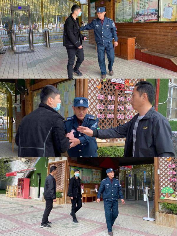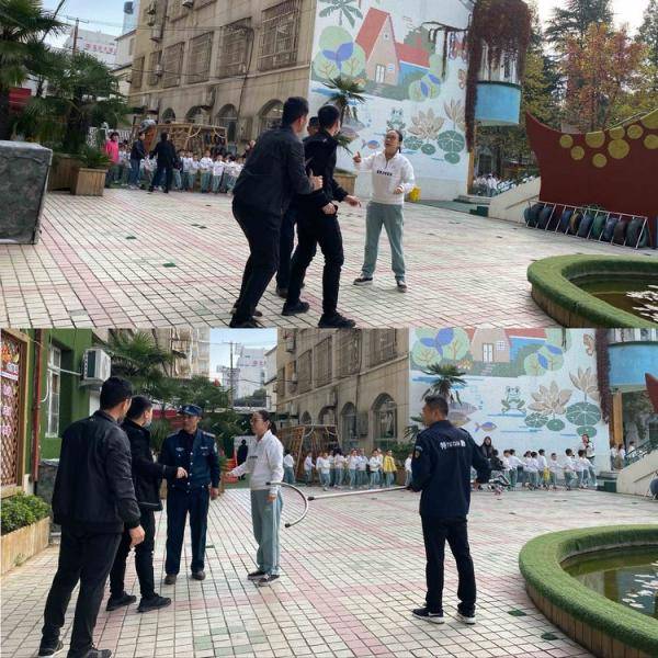 刘园长闻讯火速前往大门口增援,试图稳住“歹徒”情绪并与其进行周旋,张琳和周晓梅园长通知户外活动的班级迅速撤离至安全地点并向全体师幼发出预警,同时张敏园长立即“按下”一键报警装置?