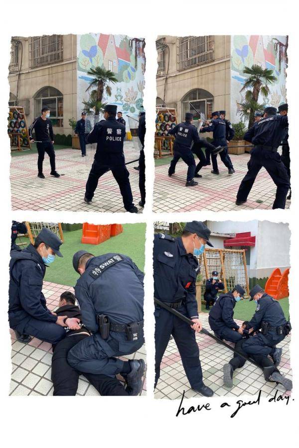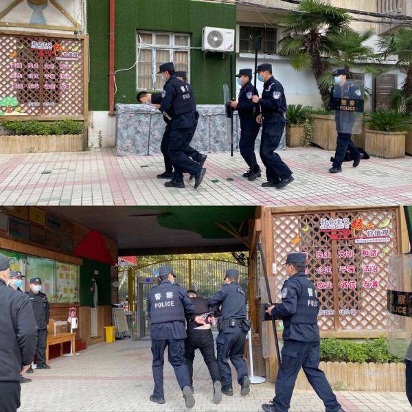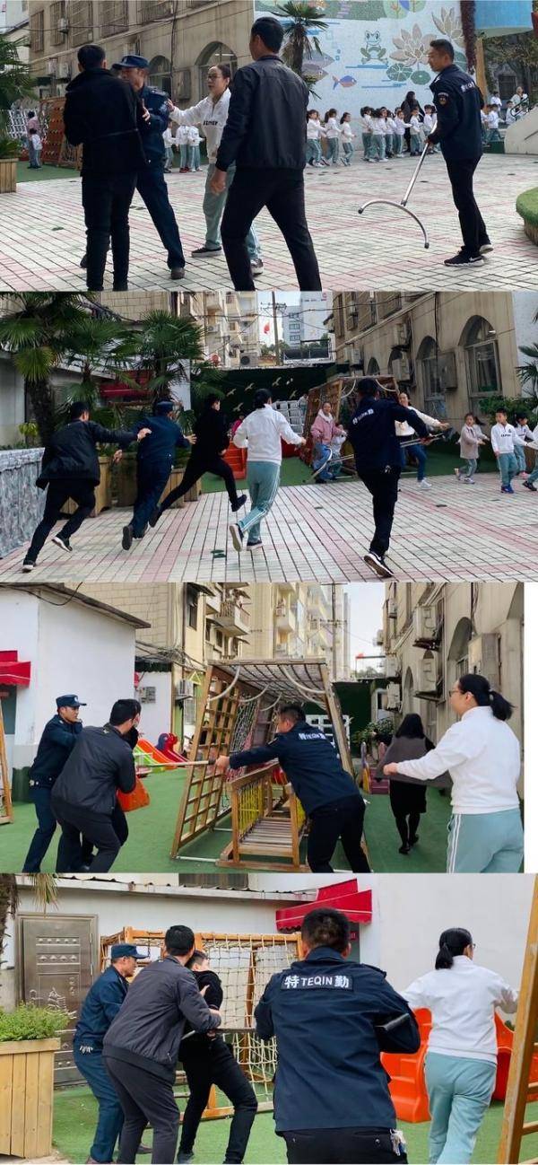 特警接到报警后迅速出动,第一时间赶到幼儿园,利用盾牌、脚叉等多种工具,迅速将“歹徒”制服,最终将“歹徒”带走。