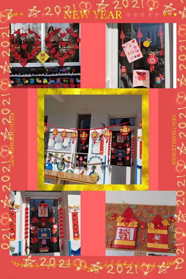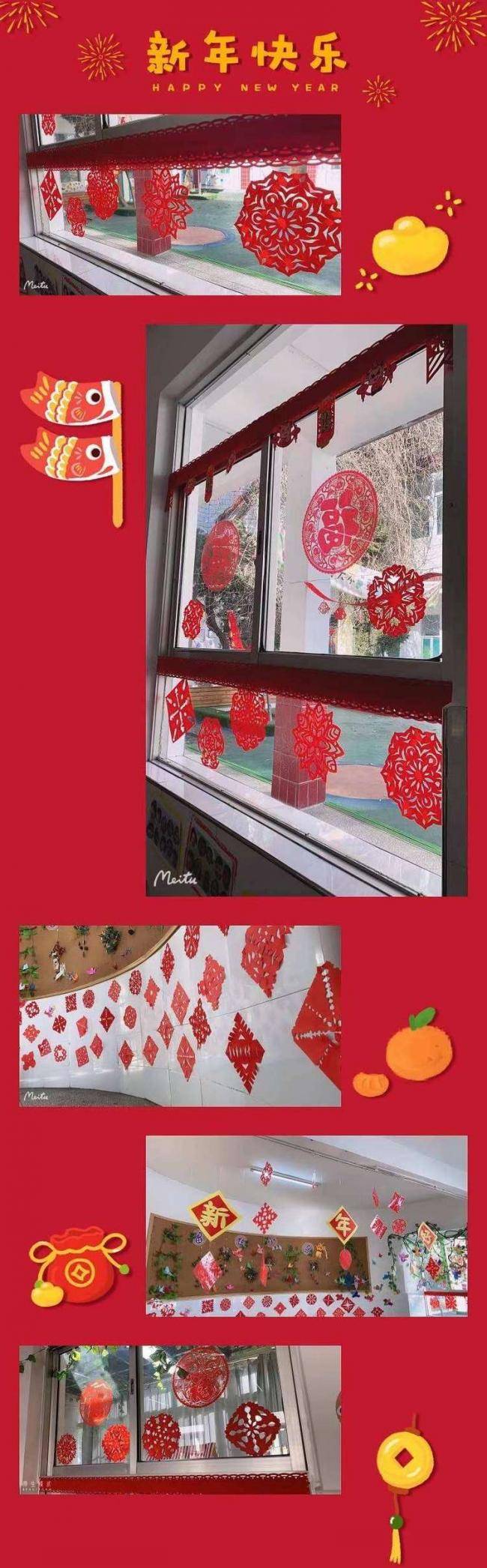 装扮新年是一项传统活动,不仅能烘托新年的气氛,还蕴含着美好的祝愿。挂灯笼,贴春联,剪窗花……每个班级都大展身手,共同迎接新年的到来。