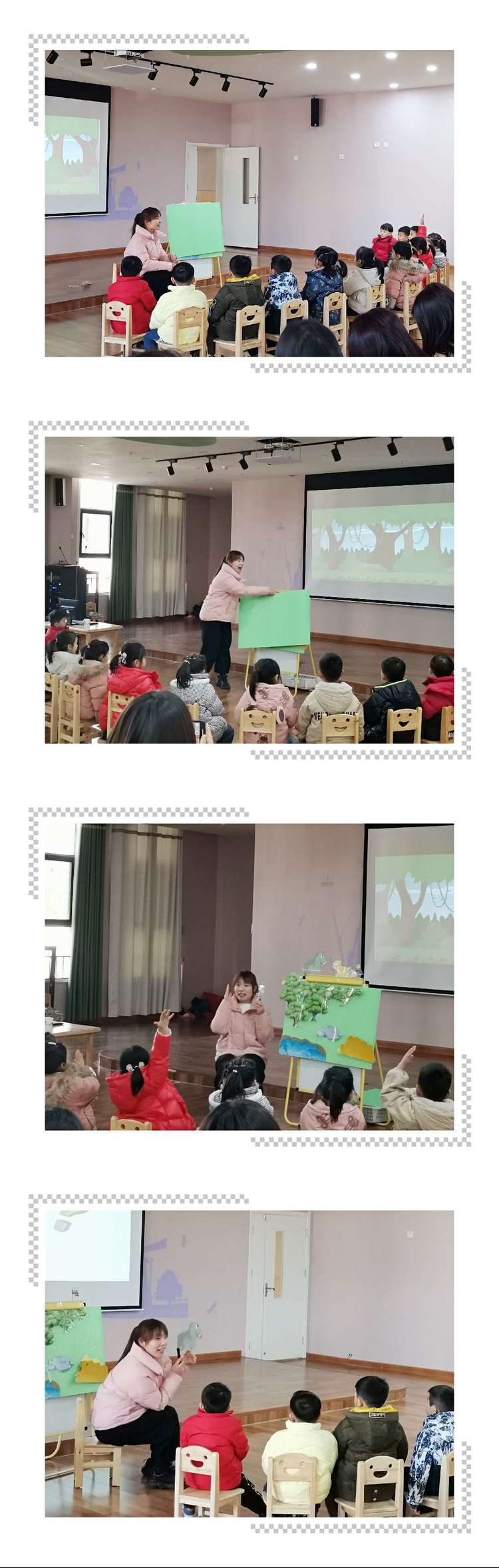 接下来,周雪凤老师带来了中班语言《大象躲在哪儿》,改编自安少版教师用书中的一节大班语言。目标设定既符合幼儿的年龄特点和发展水平,又具有趣味性,活动过程中,孩子们在老师的引导铺垫下开动脑筋、发散思维,最终帮助大象找到了合适的躲藏地点,并能用完整且有一定逻辑性的语言进行表达。