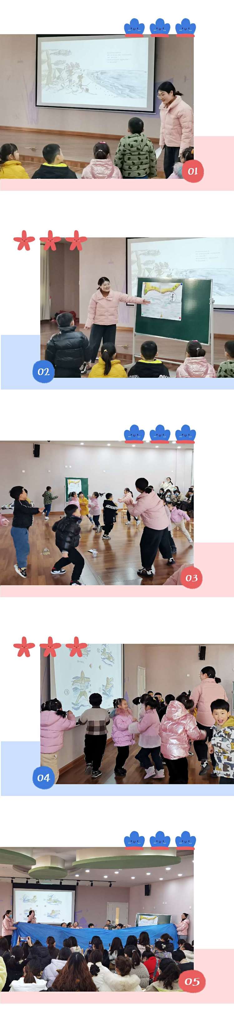 高瑞老师给大家带来了一个经典绘本系列《古利和古拉》中的一段故事,在阅读绘本的过程中,孩子们边观察绘本边倾听,跟着小田鼠古利和古拉一起探秘寻宝,还从海童那里学会了各种游泳姿势,有鲸鱼式、狗刨式、蝴蝶式、海星式等,老师和孩子们一起随乐舞动练习,看他们掌握得多熟练,都可以在大海里畅游啦。