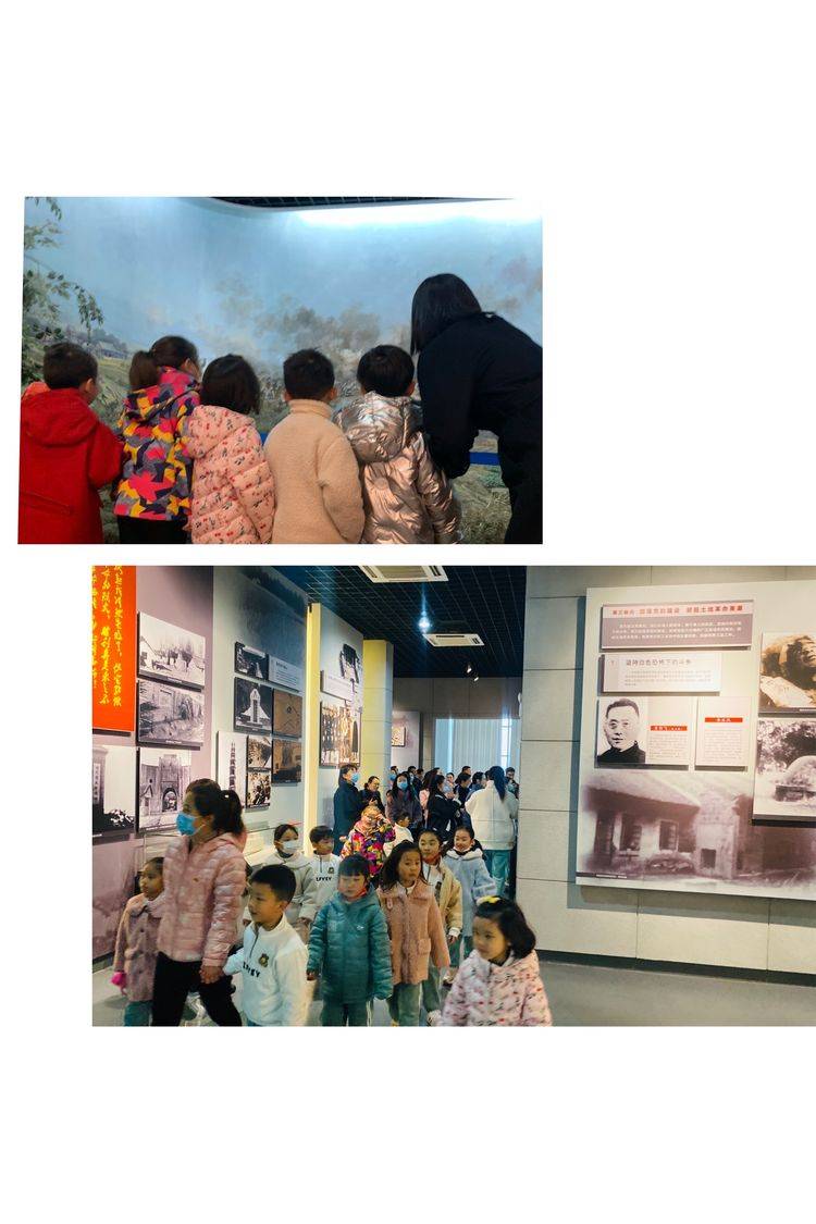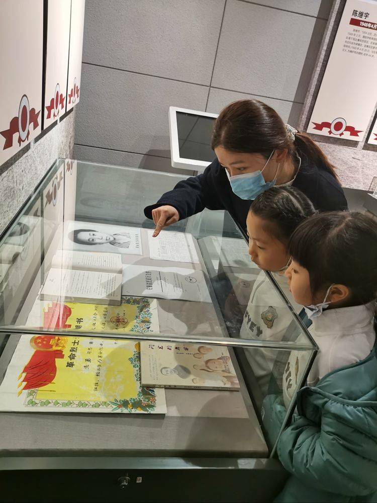 刘琴园长向幼儿讲解馆内的实物展品,其中周传鼎烈士的马靴、印章,张子珍烈士的字典等烈士生前遗物,极具收藏价值和教育意义。